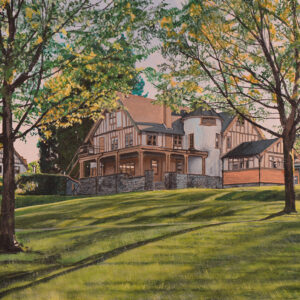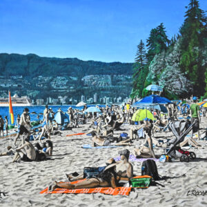 After painting Vancouver scenes for over 30 years, I finally wanted to paint something that features our North Shore Mountains as a backdrop. This scene from the Granville Street Bridge, overlooks Granville Island with its bright yellow Bridges Restaurant building and includes the marina, the Burrard Street Bridge, the highrise apartment buildings of Vancouver’s West End and the mountains.