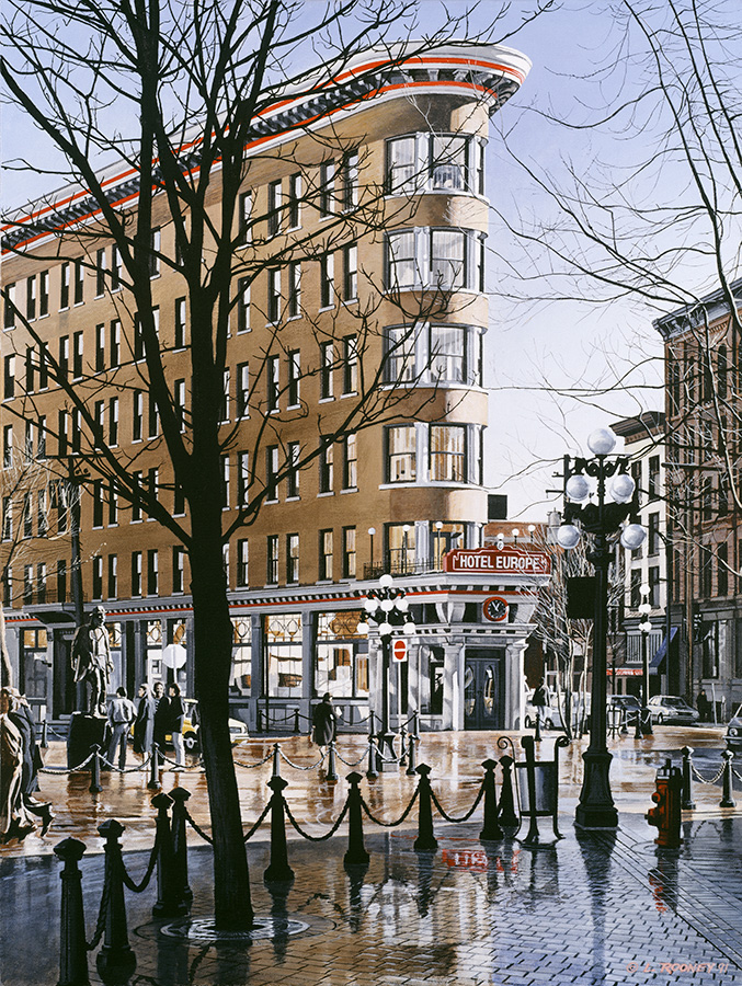 This Vancouver Gastown scene was also published as an art card in 1991, however my publisher took it out of print in 1995. I guess the tourists didn’t like this one as much as the Steam Clock image. Too bad, this was my favorite out of the two. In my first year at Emily Carr College of Art in 1980, the school was located at 21 Water Street, just a head turn to the left from this scene. Myself and other students used to eat lunch in the pub that used to occupy the ground floor of the Hotel Europe. Cheap beer, even back then—60¢ a glass.
